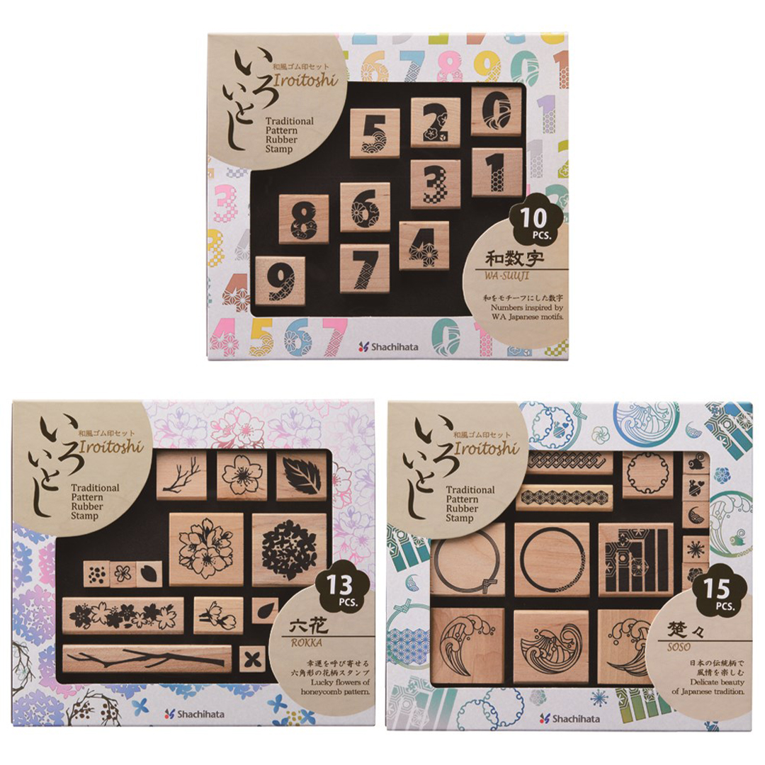 "Iroitoshi" is a series of stamp sets featuring Japanese-inspired patterns. Each set includes a collection of wooden stamps with rubber designs inspired by Japanese heritage and culture. The stamps are perfect for scrapbooking, journaling, or other creative projects.