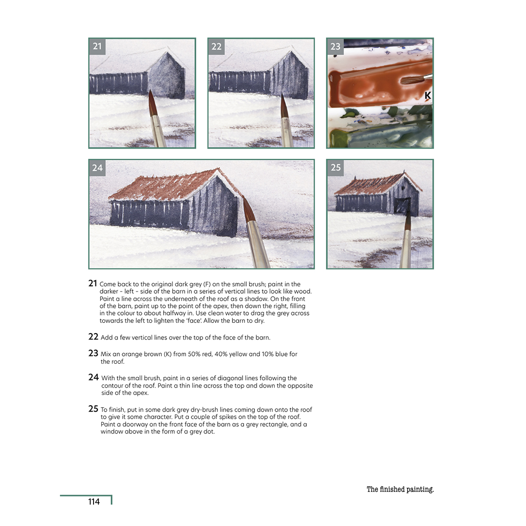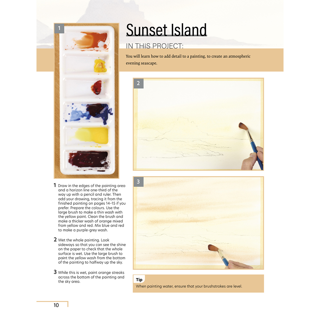 The book includes a total of 25 projects. Each project explores a range of watercolour techniques and guides you step by step through clear instructions. You’ll use only three pure colours and their many mixes, along with three brushes, to complete each painting.