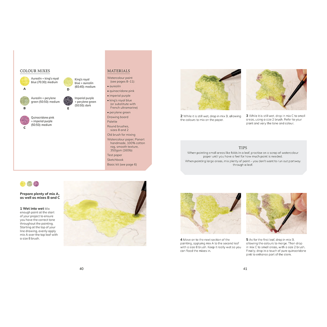 - 15 inspirational paintings with colour swatches, 5 shown step by step from start to finish;