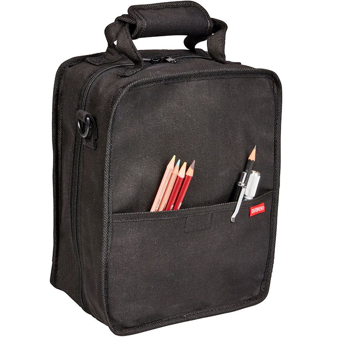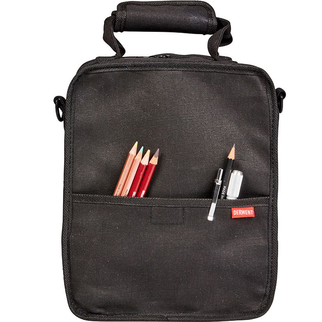 It features 3 easy-access ‘pencil leaves’ that hold up to 44 individual pencils held in place by a wide elastic strap. The leaves are easily removable and there is a mesh pocket at one end for holding drawing accessories and a strap to keep your sketchbook in place.