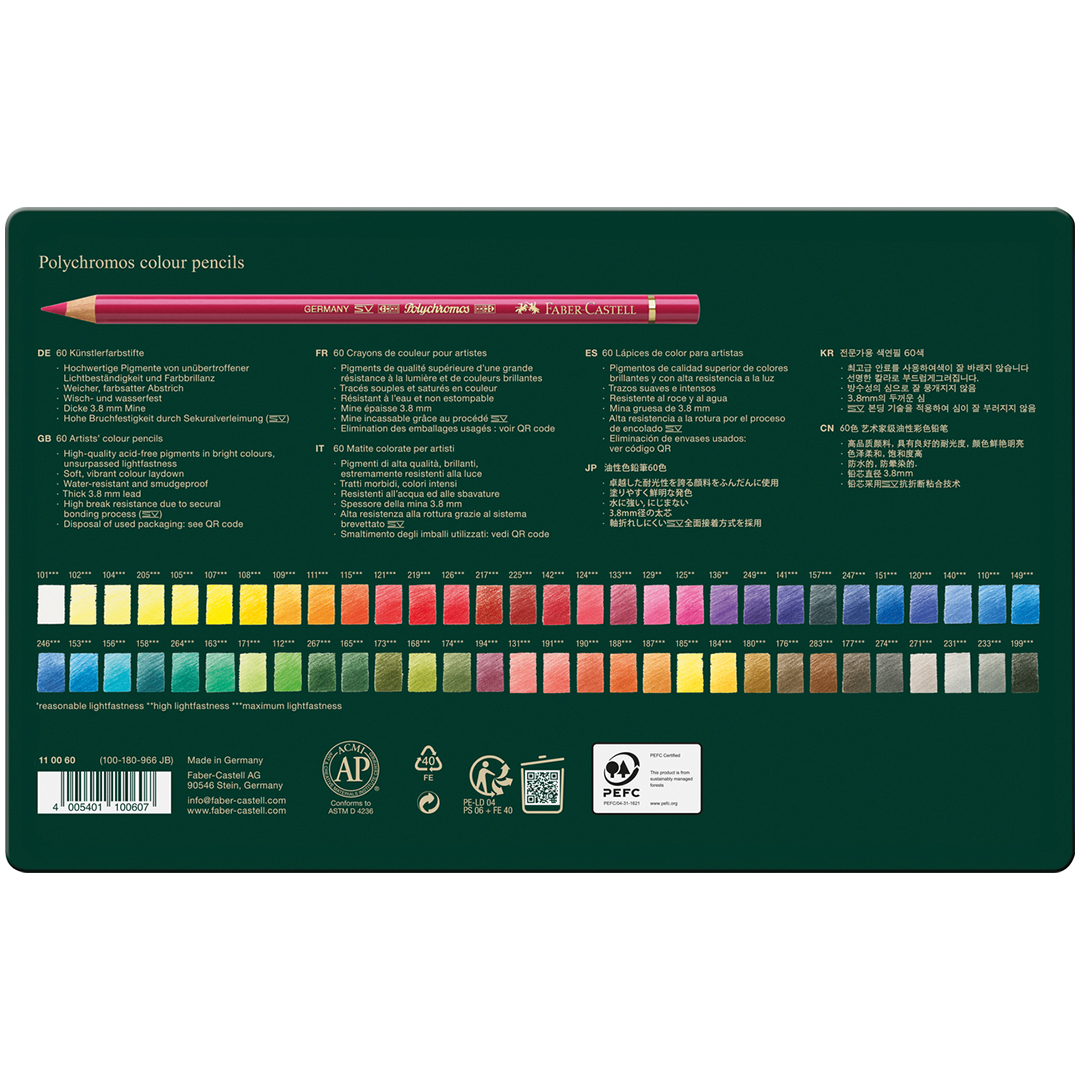With high-quality, acid-free pigments, Polychromos deliver unbeatable lightfastness that preserves colour brilliance for decades, alongside maximum break resistance, smudge and water resistance, and exceptional drawing characteristics.