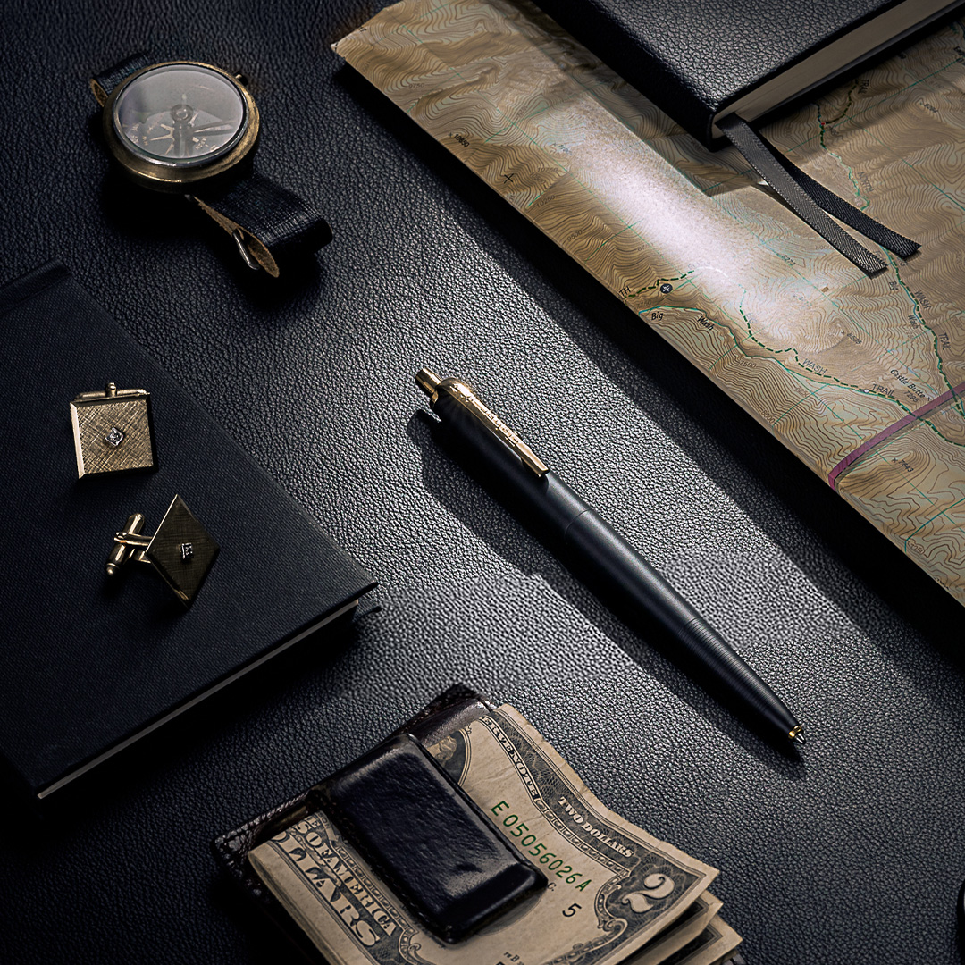 The pen has a solid brass body with graphite black Cerakote finish and golden titanium-nitride plated details. It is made entirely of metal, giving it a well-balanced weight.