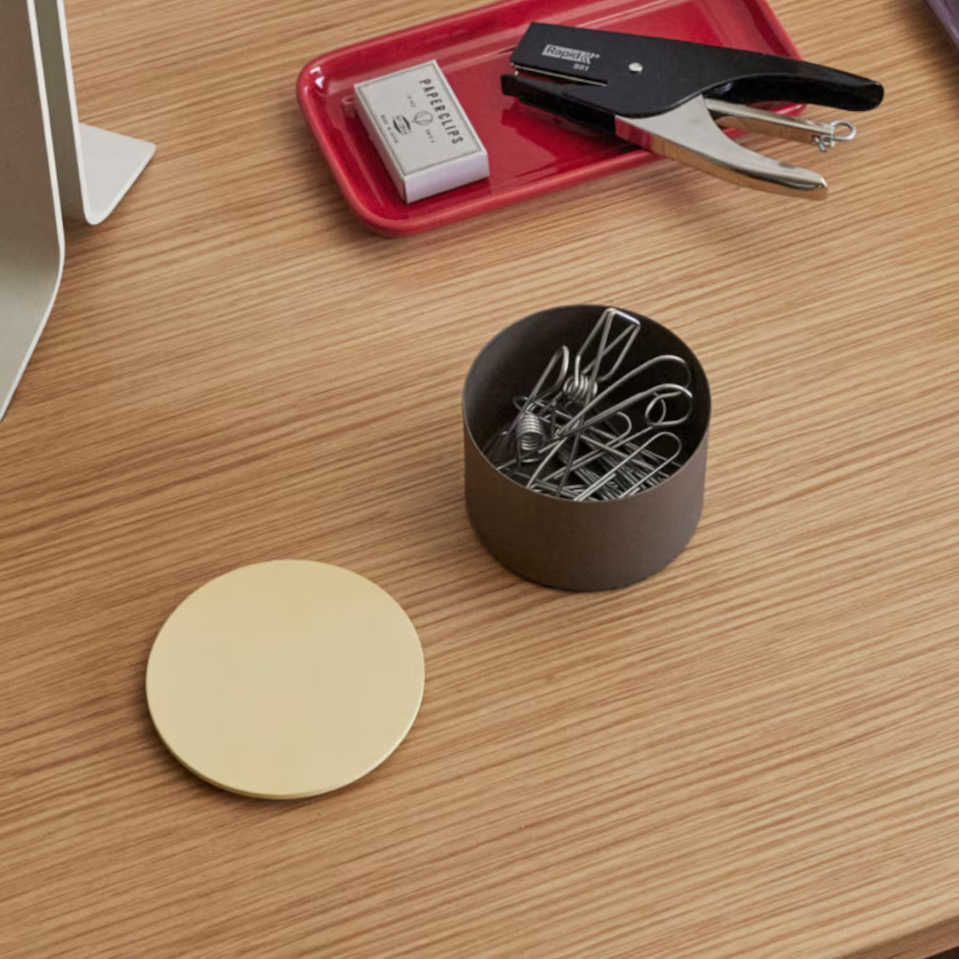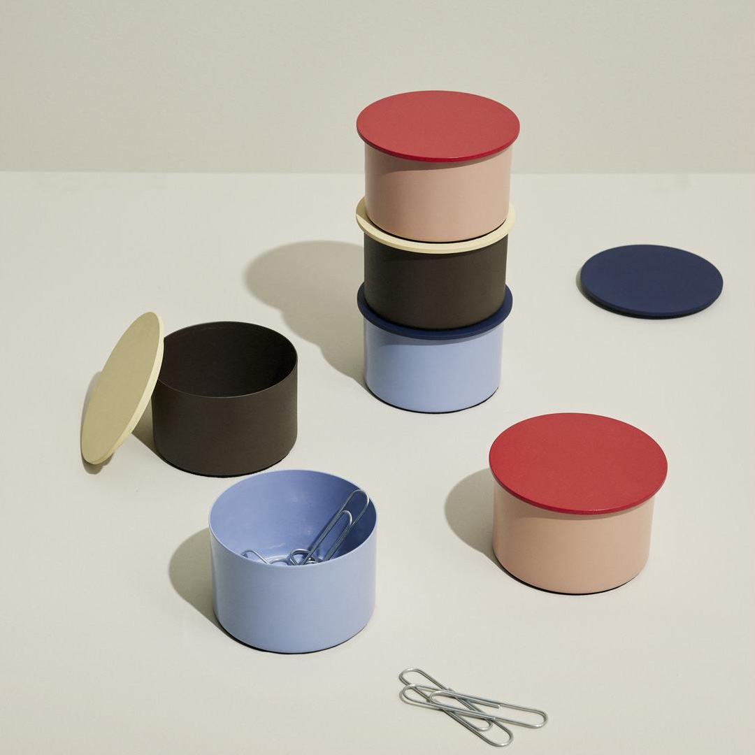 This small storage jar in powder-coated metal is a practical detail that makes it easy to keep small items organised. With its lively colour combination, it also becomes a decorative feature on a desk, on a shelf or in a hobby corner. The jar is perfect for office essentials such as paper clips, erasers and pencil sharpeners.