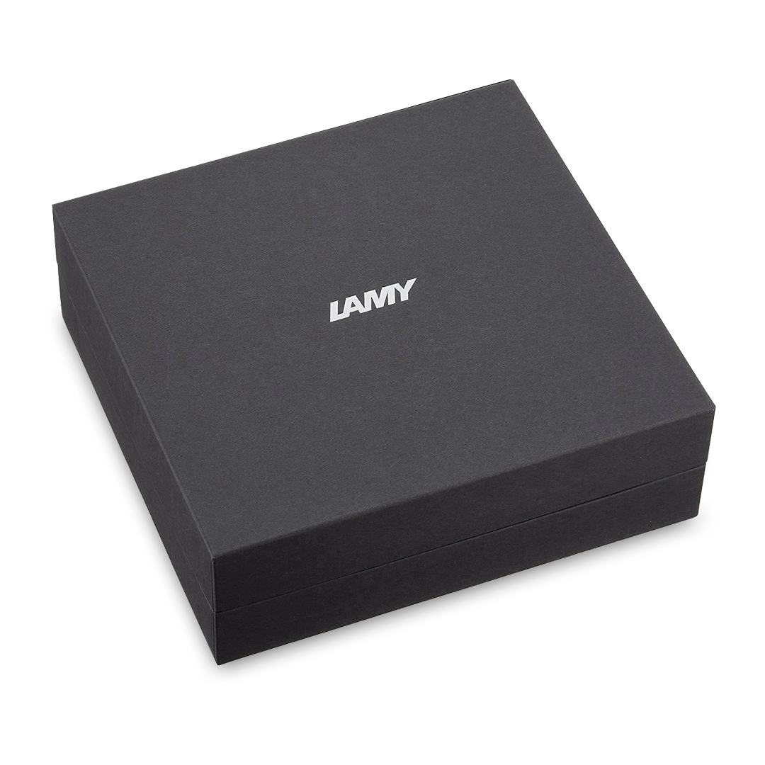 The pen has a matte black lacquered finish. Rhodium-plated 14-karat gold nib for a smooth writing experience. Fill with Lamy T 10 cartridges or from a bottle using the included Z 27 converter. The pen is delivered in an elegant gift box and a corresponding leather case.