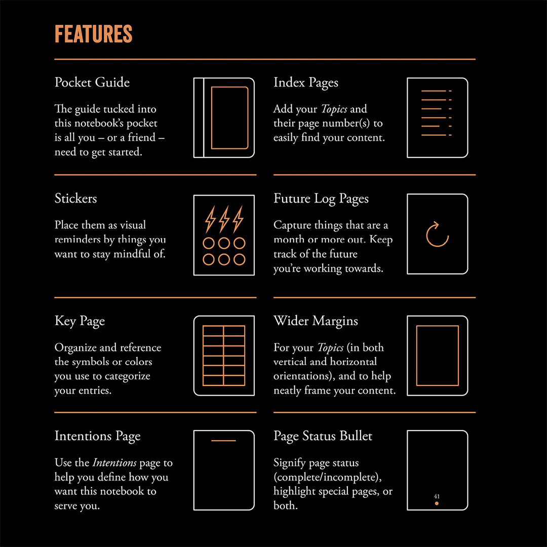 Bullet Journal Edition 2 also features page margins and extra markers to help you structure and locate content quickly. A table of contents, future log, index, and accompanying stickers make it easy to personalise and organise the notebook. An elastic band keeps the notebook closed, and an internal pocket is included on the inside of the back cover.