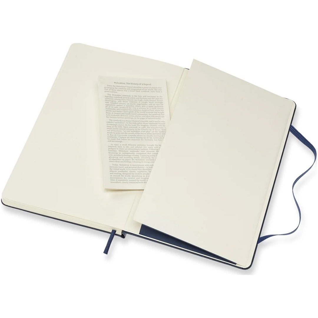 Hard cover notebook in Large size (13 × 21 cm) from Italian brand Moleskine. The notebook contains 240 pages and features an expandable inner pocket and an elastic closure to keep it securely shut when not in use. The ivory-coloured paper is FSC-certified, acid-free, and of premium quality!