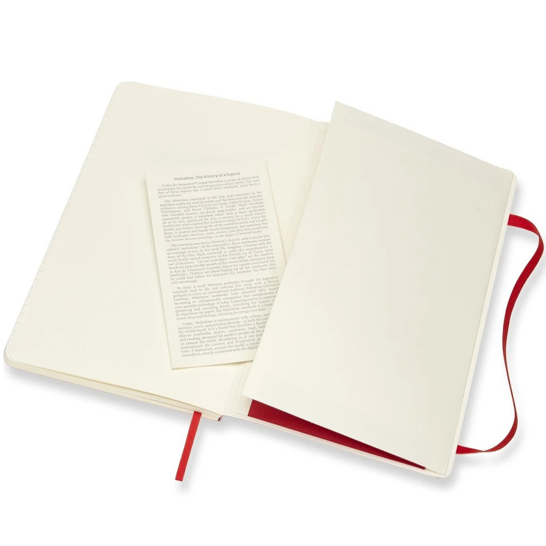 Soft, flexible cover notebook in Large size (13 × 21 cm) from Italian brand Moleskine. The notebook contains 192 pages and includes an expandable inner pocket and an elastic closure that keeps it securely shut when not in use. The ivory-coloured paper is FSC-certified, acid-free, and of premium quality!