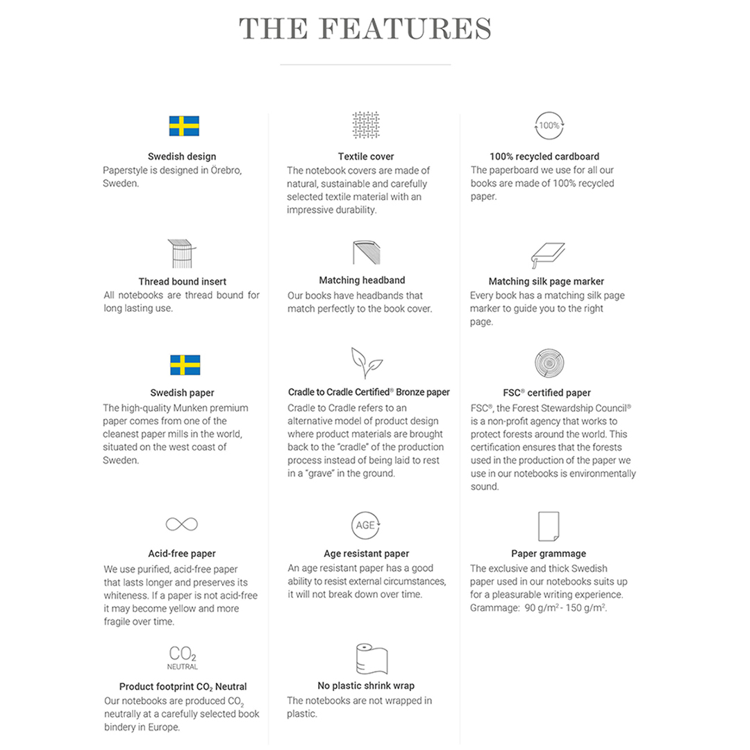 The notebook opens completely flat and contains the absolute best paper – Acid-free and age-resistant Munken 100g paper. The paper is also both FSC certified and Cradle to Cradle certified.