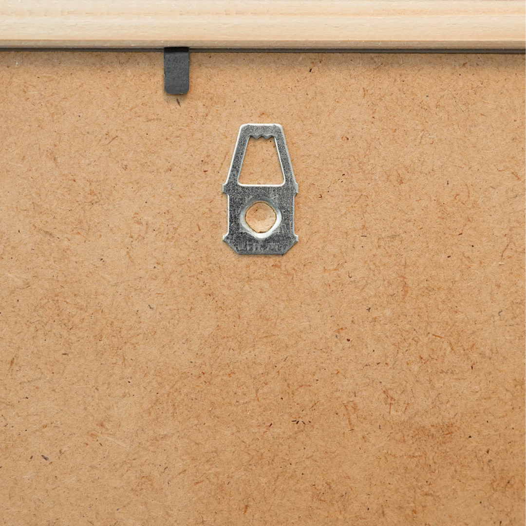 This frame is supplied with clear acrylic glass and has a back piece with hanging loops for both vertical and horizontal wall placement. The backing is held in place by bendable pins, and is easy to remove when the picture is mounted. The frame can also be used with a passe-partout, which can be purchased separately.