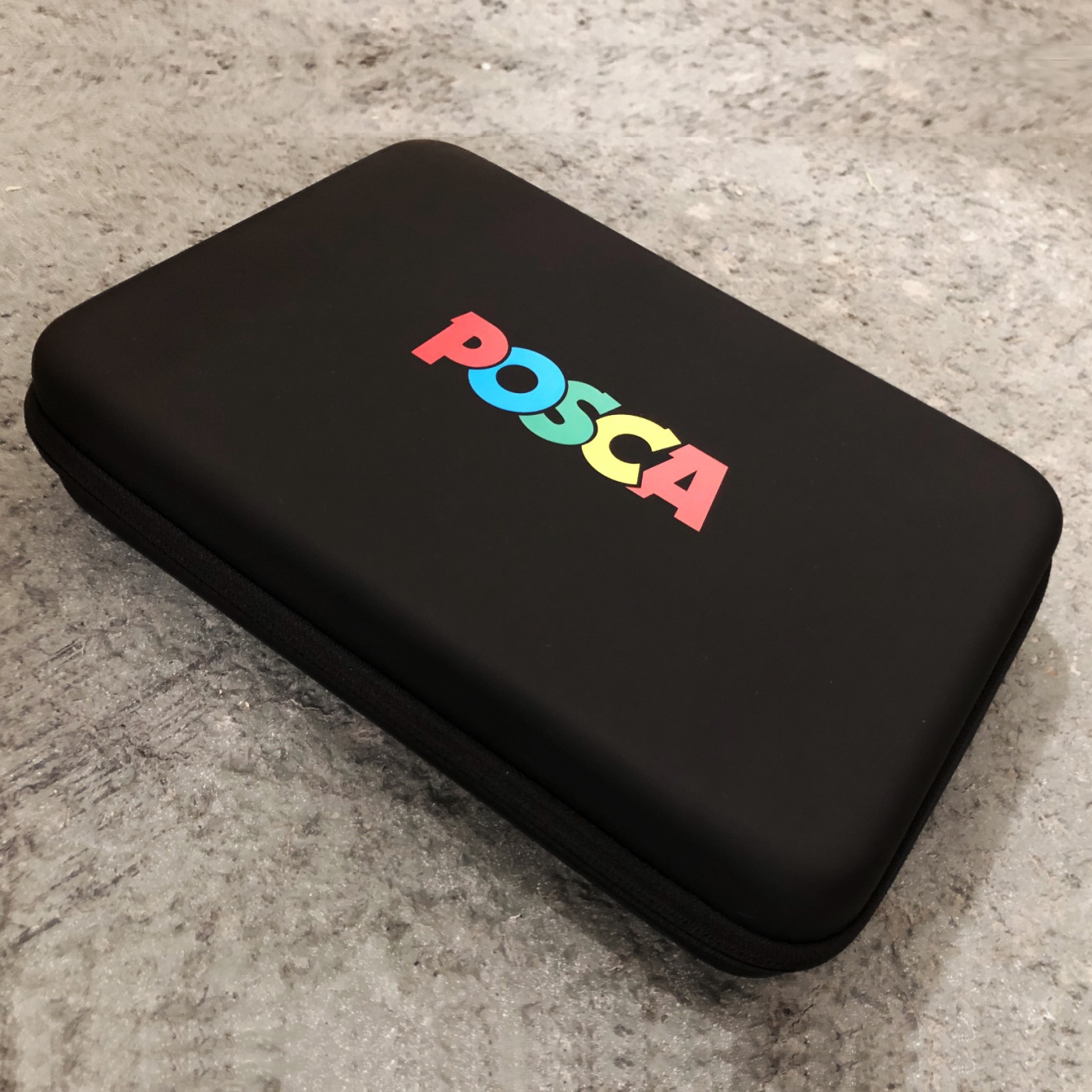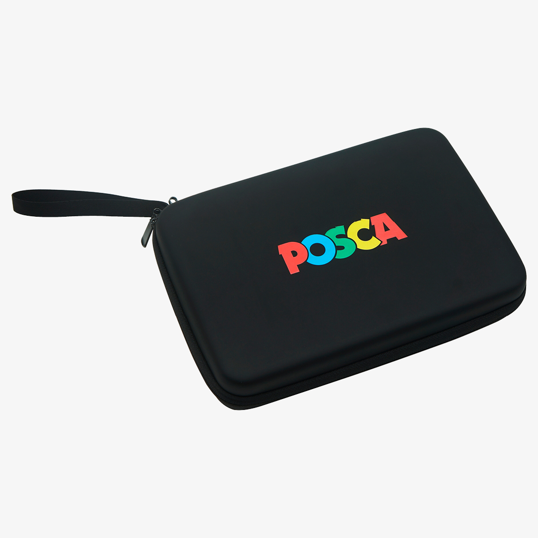 Comes in a sturdy, high-quality case with a hard exterior and rubberised surface. Zipper, strap for carrying and Posca logo printed on the front.