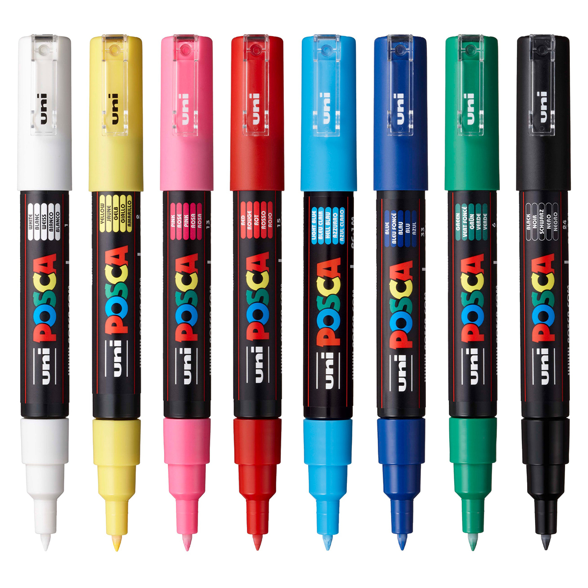 The set contains 8 pieces of Posca PC-1MC. Colours: Black, Green, Light Blue, Blue, Red, Pink, Yellow, White.