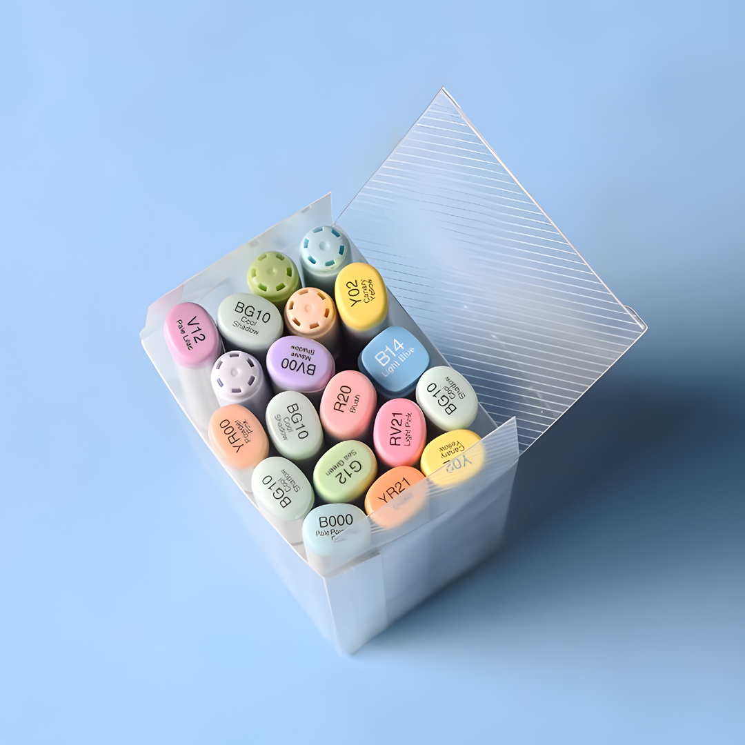 Watercolour markers, on the other hand, are transparent and water-soluble. They work much like watercolours in pen format: you can draw directly on paper and then add water with a brush to create flowing gradients and soft colour transitions. This makes them particularly appreciated by illustrators and creatives who like to experiment with shading, blending and vivid colour effects.