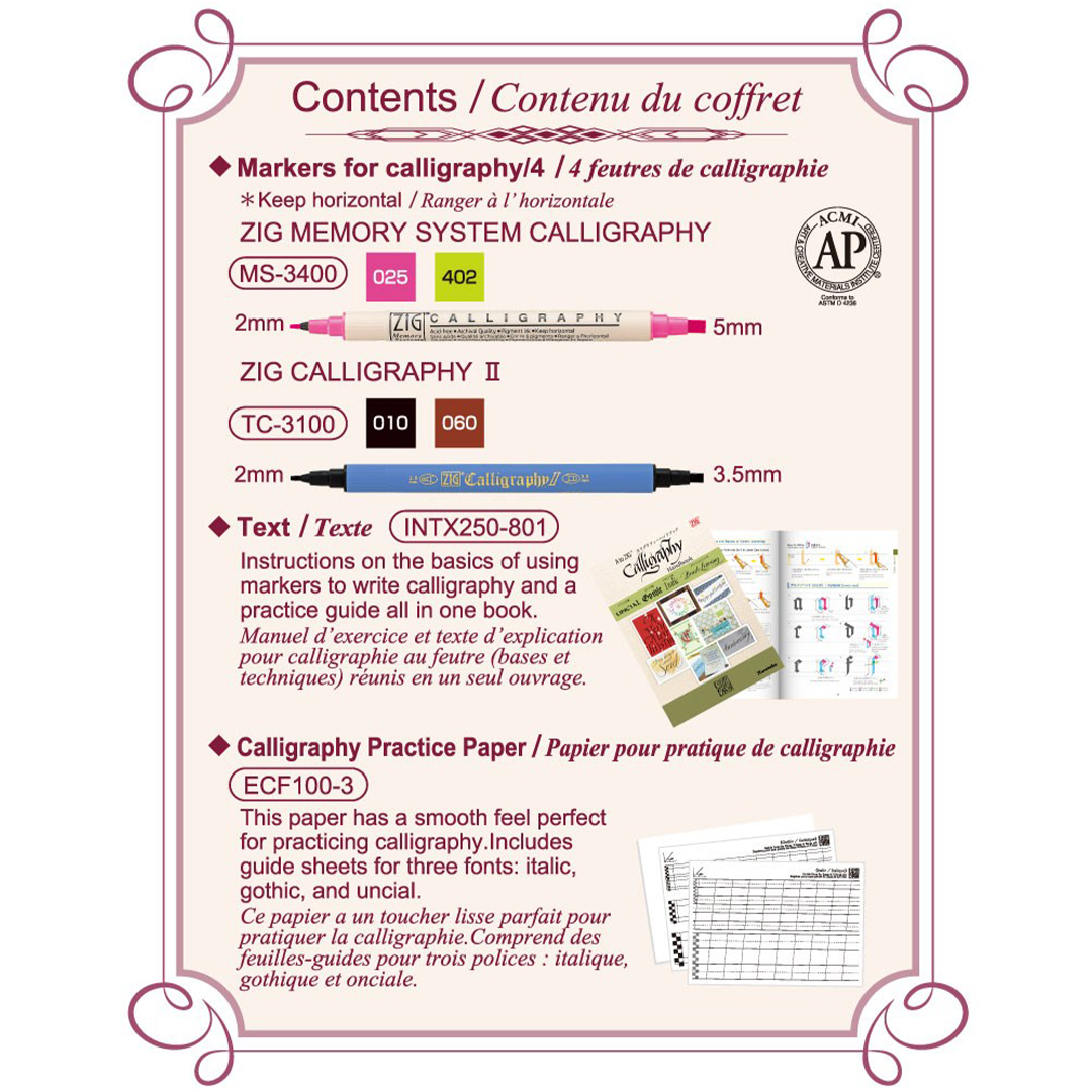 This carefully designed set includes everything you need to get started – easy-to-use calligraphy pens, practice paper and an inspiring handbook that guides you step by step into the art of calligraphy.